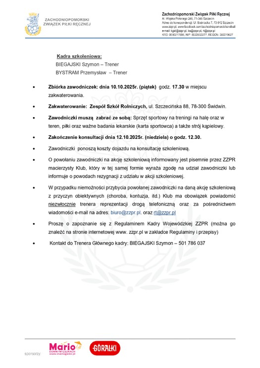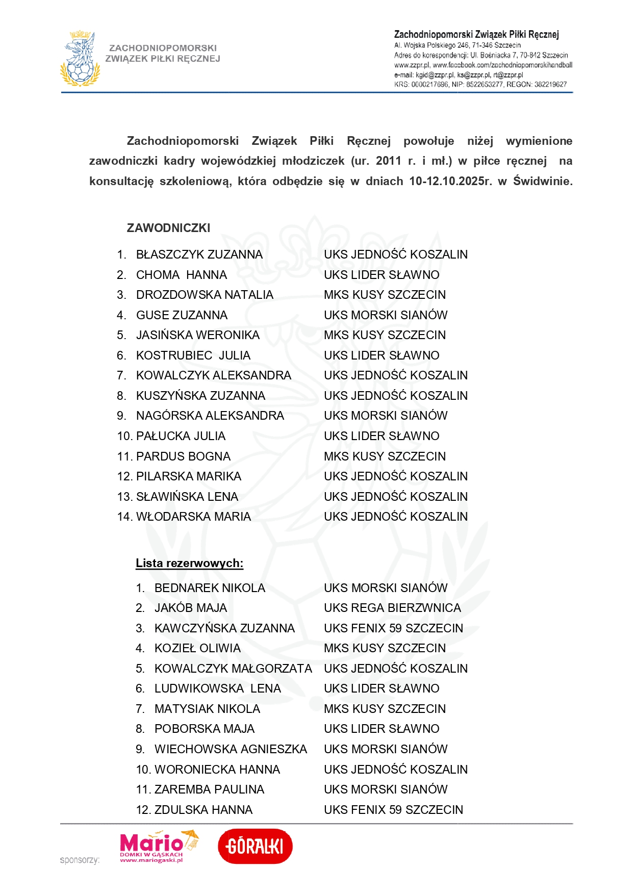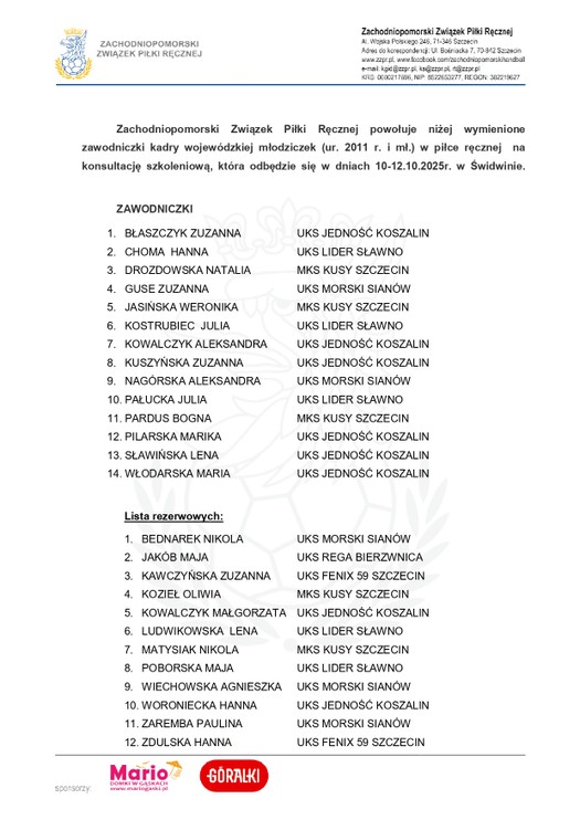 Zachodniopomorski Związek Piłki Ręcznej powołuje niżej wymienione zawodniczki kadry wojewódzkiej młodziczek (ur. 2011 r. i mł.) w piłce ręcznej na