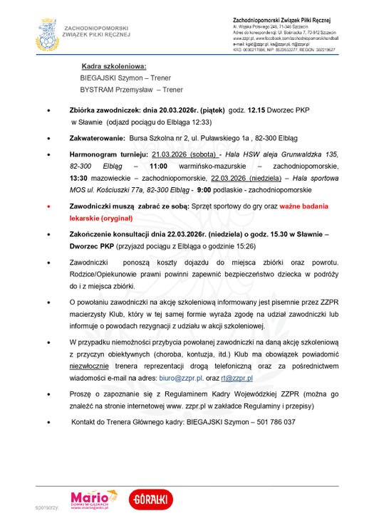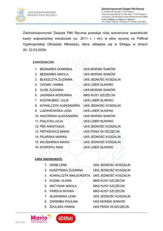 Zachodniopomorski Związek Piłki Ręcznej powołuje niżej wymienione zawodniczki kadry wojewódzkiej młodziczek (ur. 2011 r. i mł.) w piłce ręcznej na Półfinał Ogólnopolskiej Olimpiady Młodzieży, która odbędzie się w Elblągu w dniach 20- 22.03.2026r.