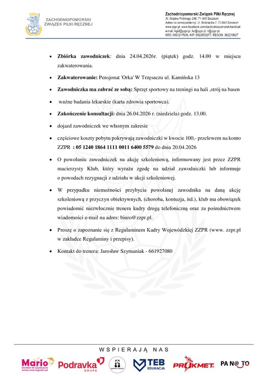 Zachodniopomorski Związek Piłki Ręcznej powołuje niżej wymienione zawodniczki kadry wojewódzkiej młodziczek (ur. 2012 r i mł.) w piłce ręcznej na konsultację szkoleniową, która odbędzie się w dniach 24-26.04.2026 r w Rewalu.