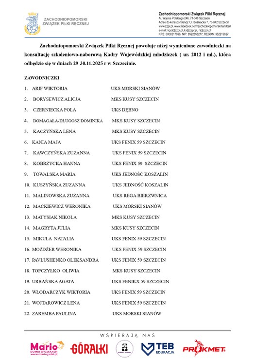 Zachodniopomorski Związek Piłki Ręcznej powołuje niżej wymienione zawodniczki na