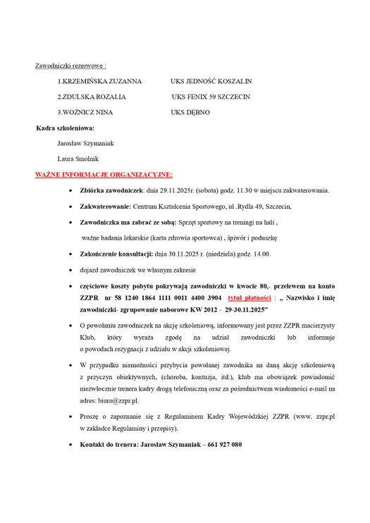 ZZPR powołuje niżej wymienione zawodniczki na konsultację szkoleniowo naborową Kadry Wojewódzkiej młodziczek ( ur. 2012 i mł.), SZCZECIN
