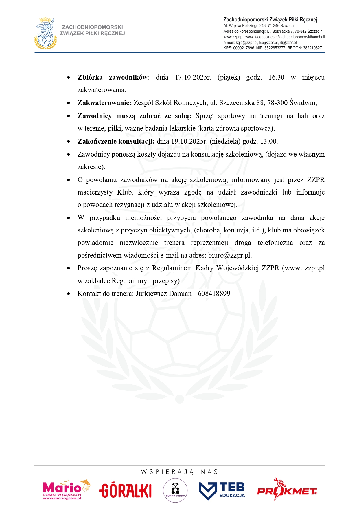 Zachodniopomorski Związek Piłki Ręcznej powołuje niżej wymienionych zawodników kadry wojewódzkiej młodzików (ur. 2011 r i mł.) w piłce ręcznej na konsultację szkoleniową, która odbędzie się w dniach 17-19.10.2025 r w Świdwinie.