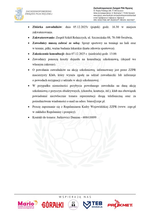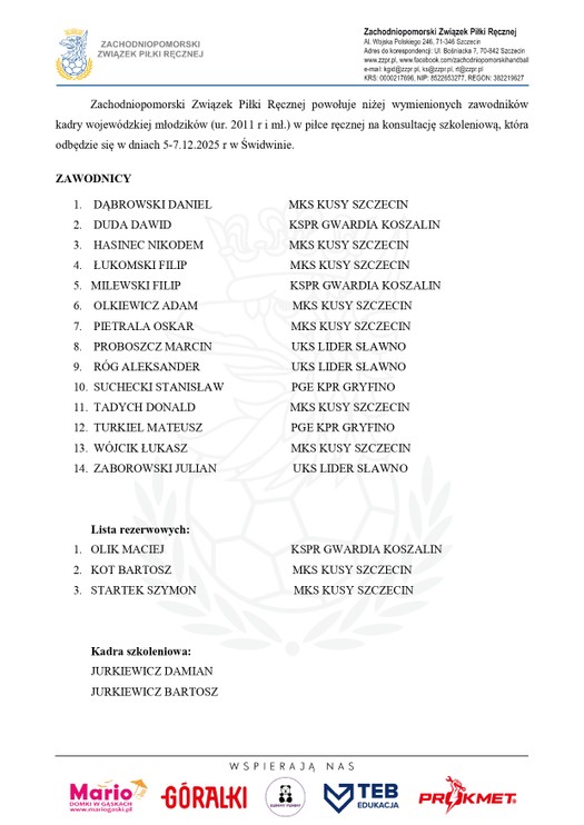Zachodniopomorski Związek Piłki Ręcznej powołuje niżej wymienionych zawodników kadry wojewódzkiej młodzików (ur. 2011 r i mł.) w piłce ręcznej na konsultację szkoleniową, która odbędzie się w dniach 5-7.12.2025 r w Świdwinie.
