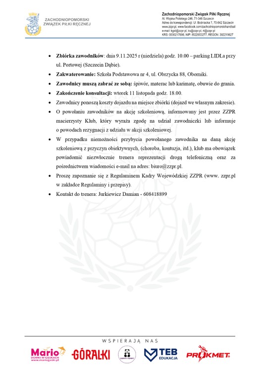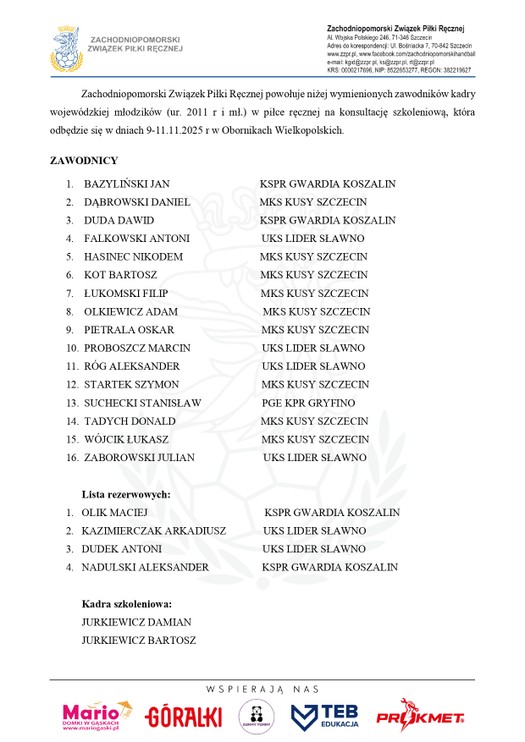 Zachodniopomorski Związek Piłki Ręcznej powołuje niżej wymienionych zawodników kadry